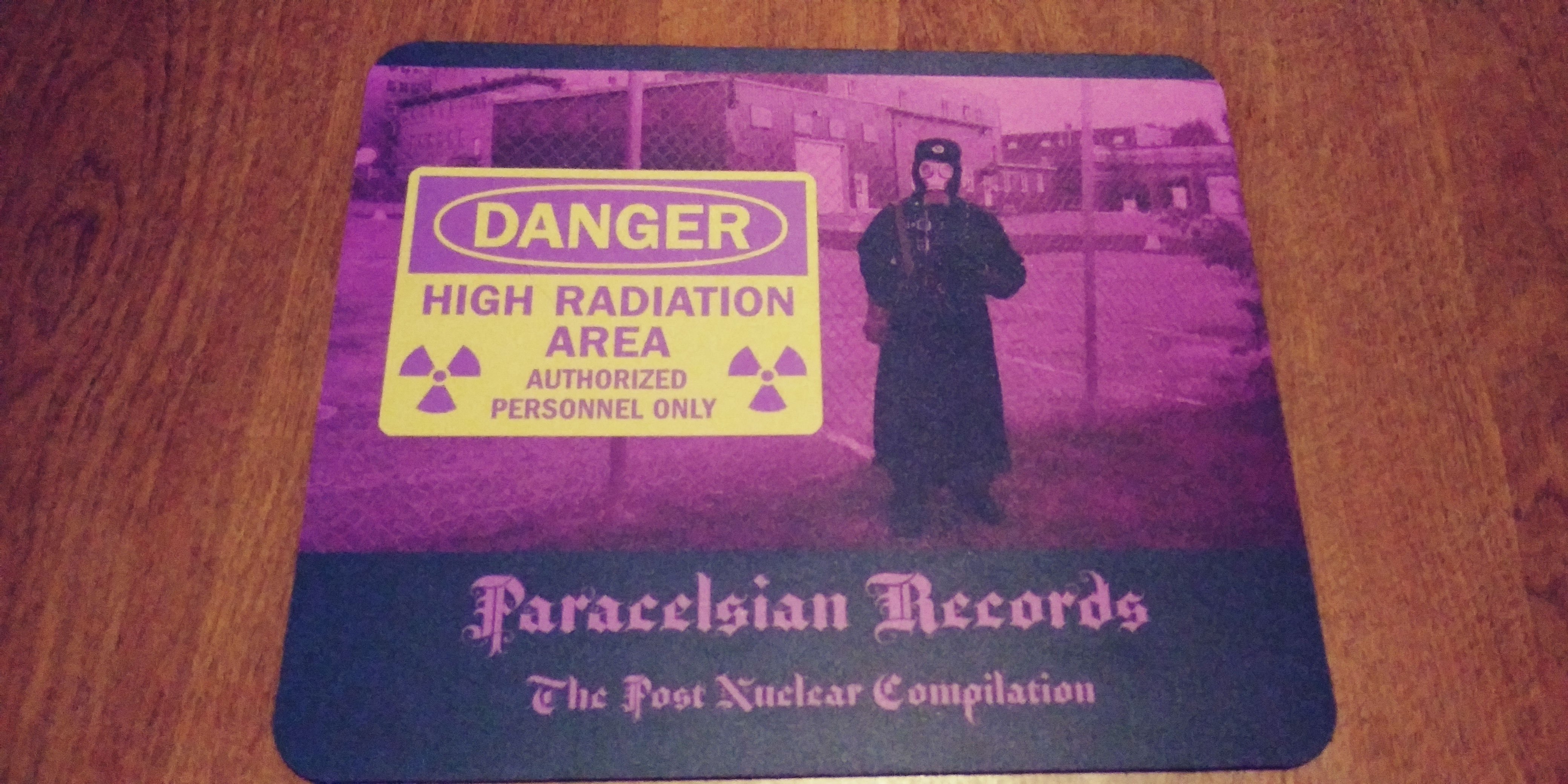 The ultimate Mouse Pad for all Post Apocalyptic , Noise Ambient Music , Fallout , Wasteland fans out there , I present to you all this Paracelsian Records Mouse Pad , unbelievably rad looking , bright colors and Gothic script. This was made for the release of the Post Nuclear Compilation.