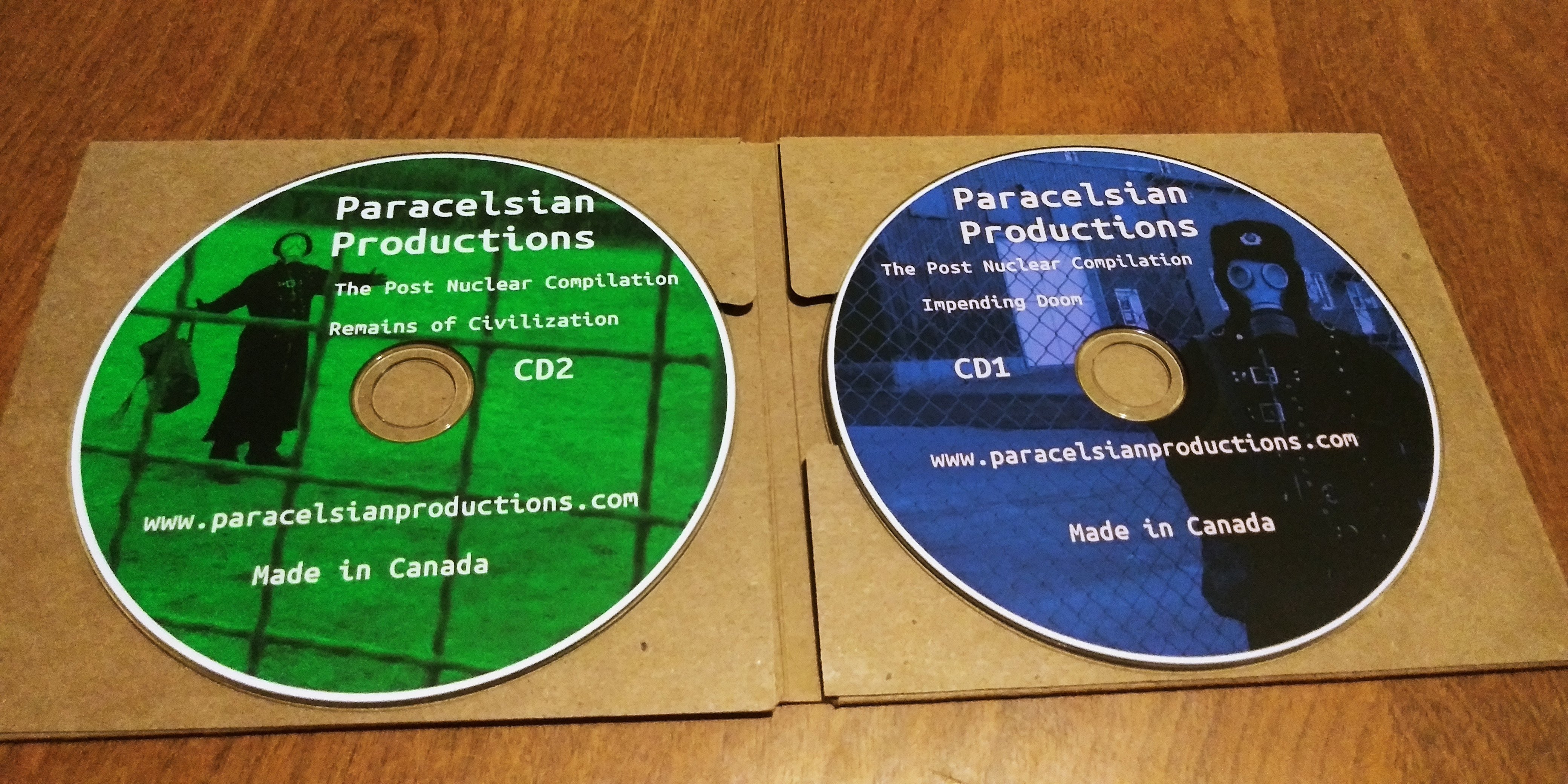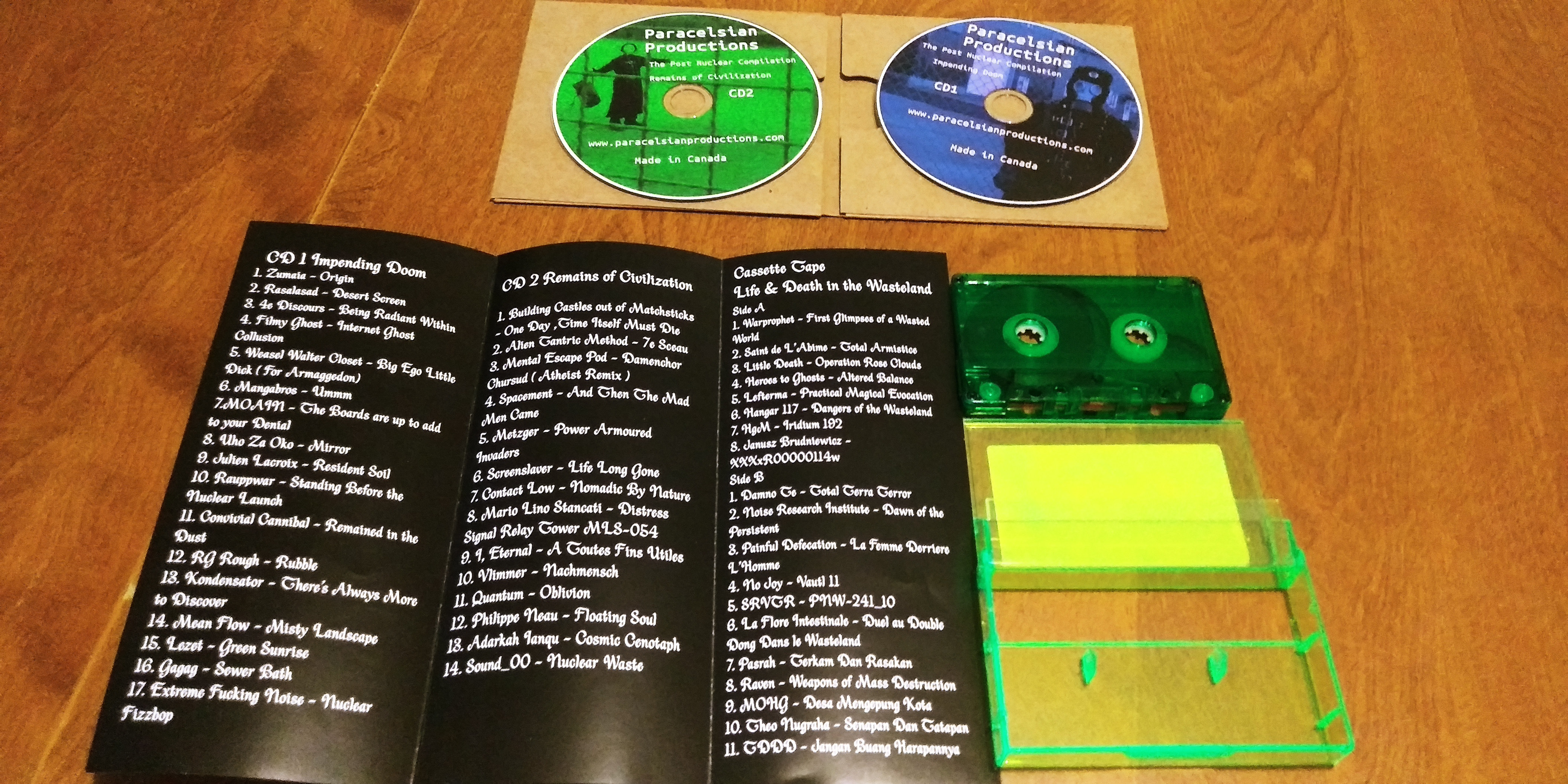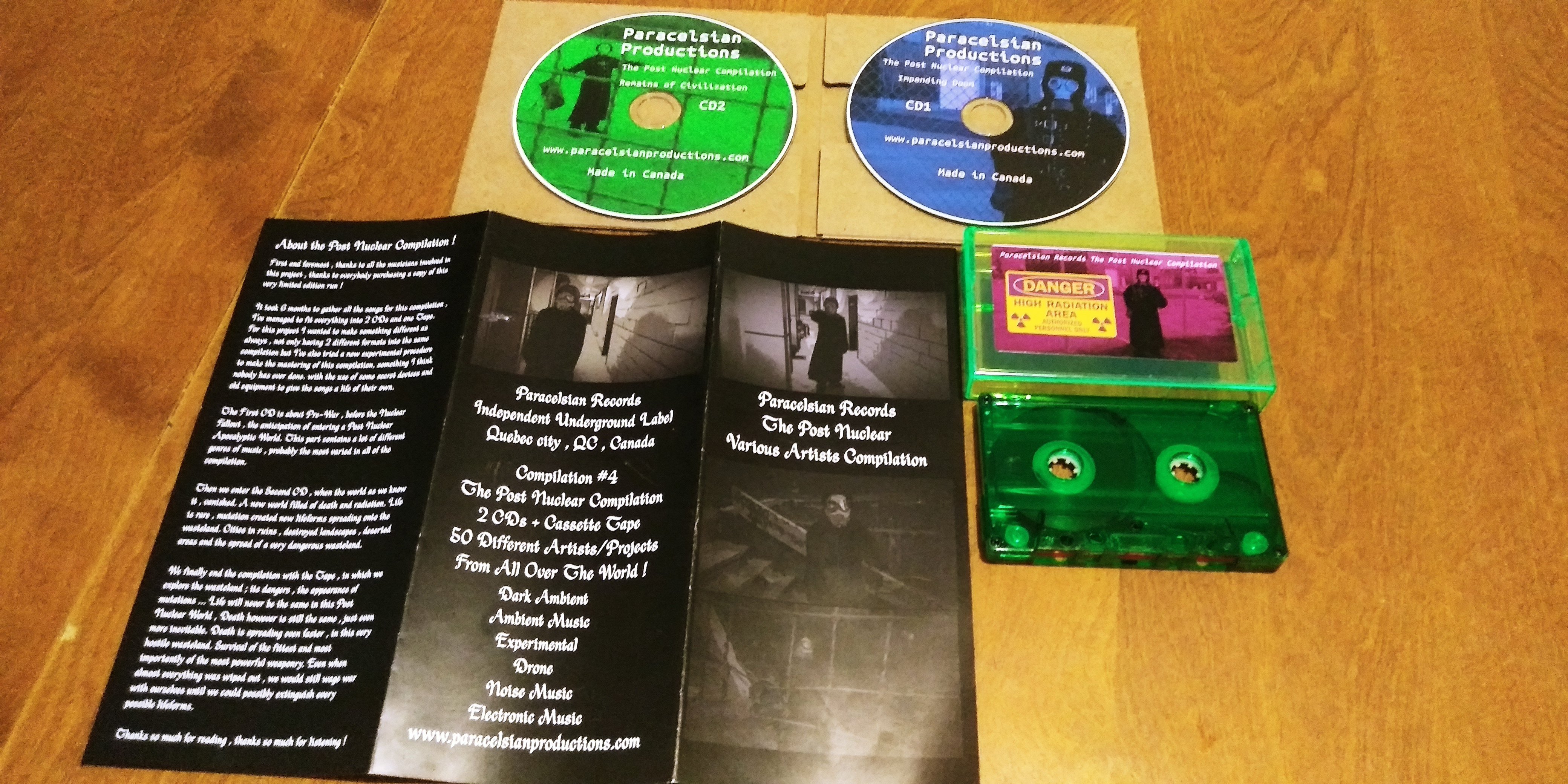 This package contains the 2 CDs & Cassette with the brochure that has the track listings, back story and other infos. The CDs are Falcon Pro brand, with 50 years lifetime and increased playback reliability , to be sure they survive an impending post nuclear apocalypse ! The Cassettes are Super Ferro grade so they can reproduce the enhanced sub low frequencies from the special analog mastering process of the compilation.