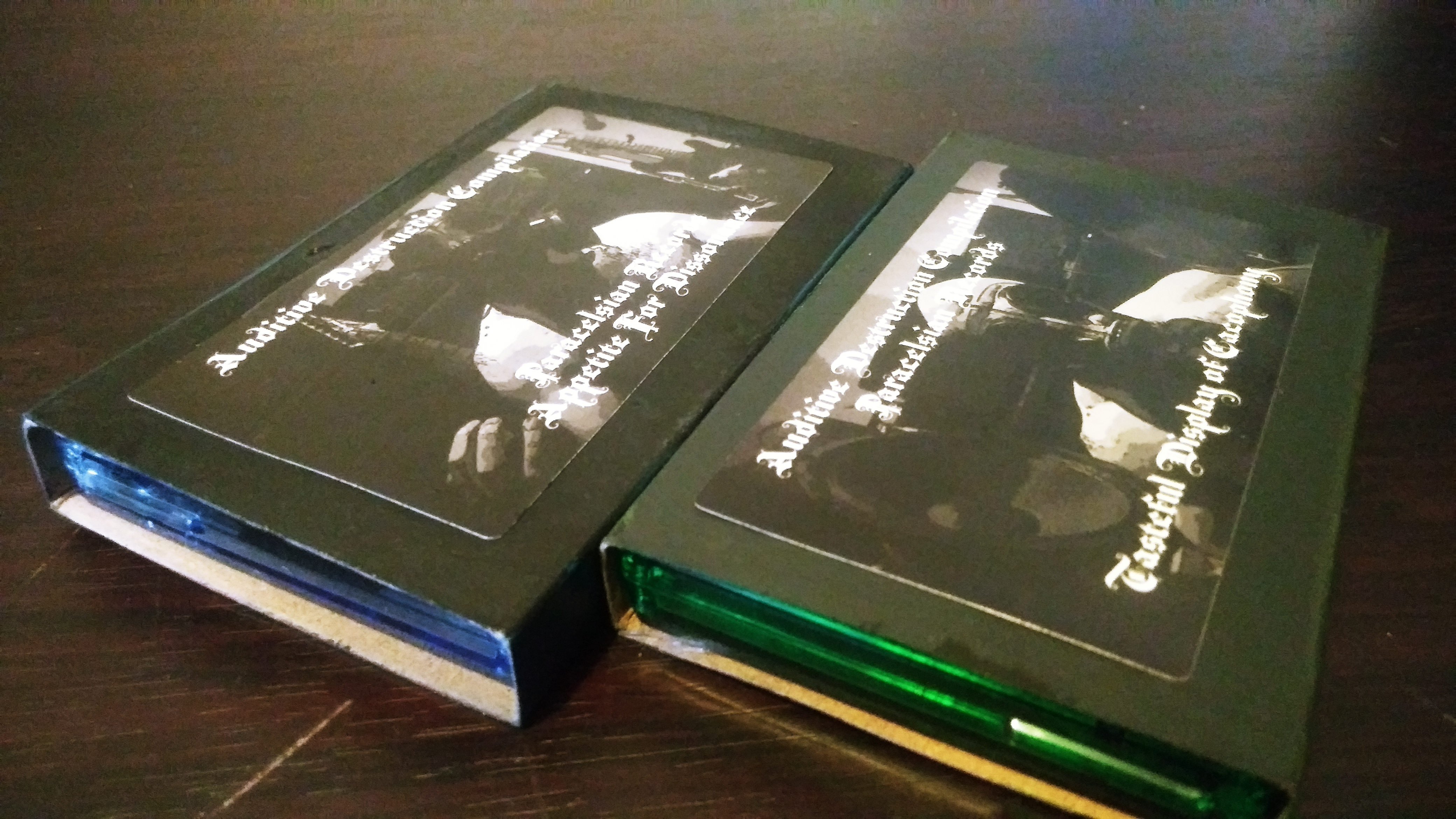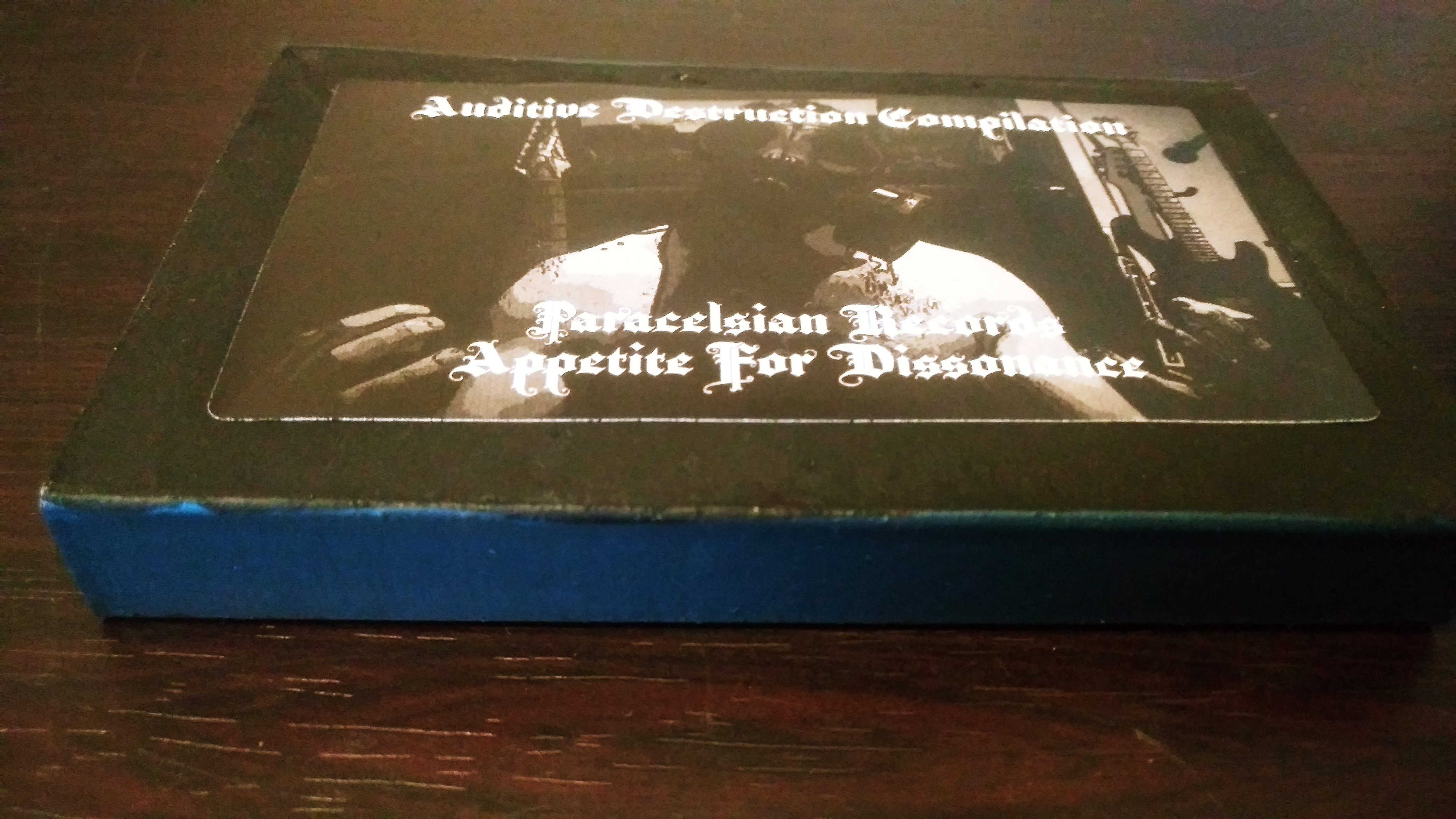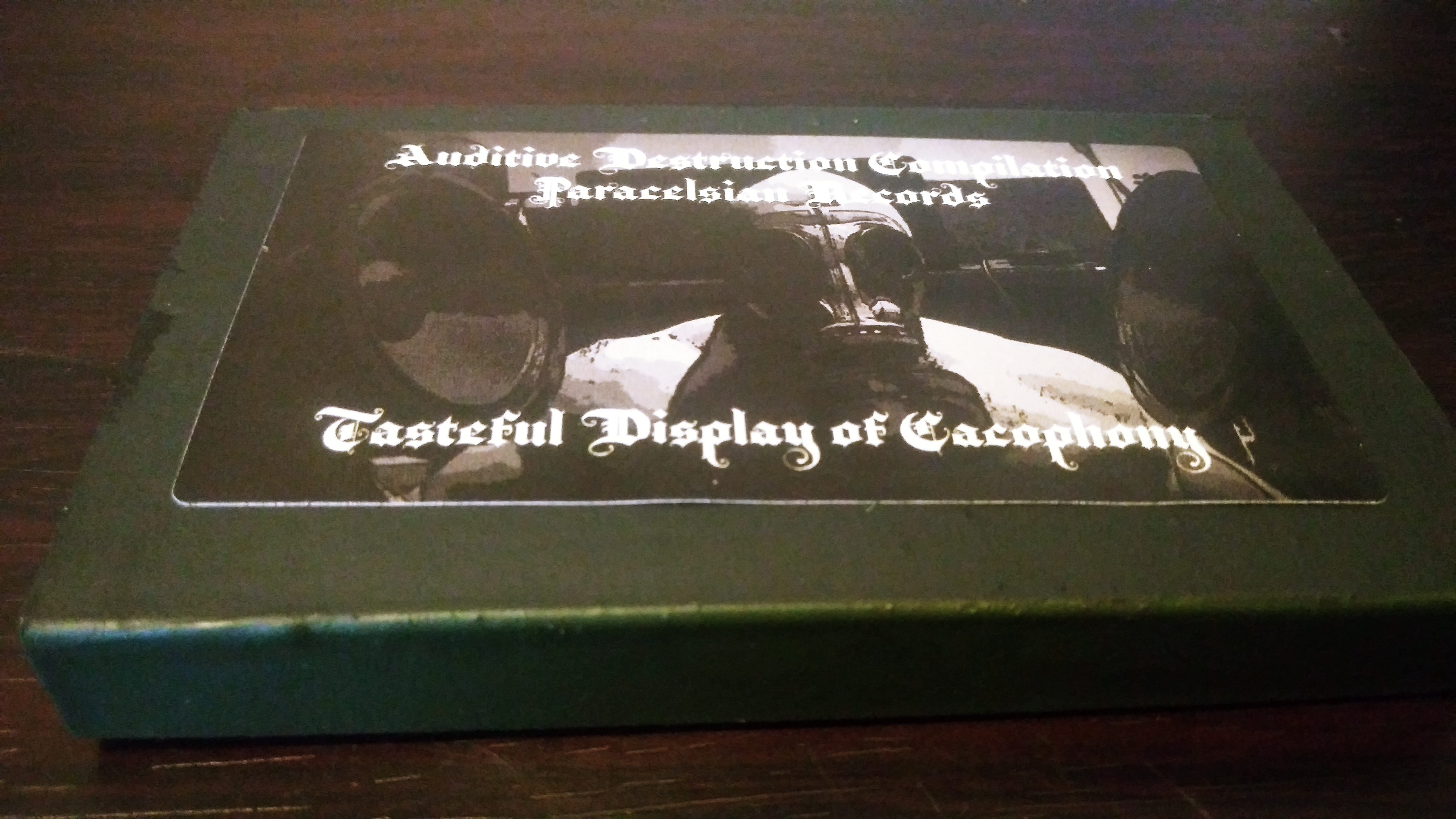 Auditive Destruction is the second Only Noise Compilation from Paracelsian Productions , as a sequel to the Radio Noise Interference Compilation. For this Compilation the name of each parts is a play on a name of a famous album ; Tasteful Display of Cacophony & Appetite For Dissonance. The Compilation features 36 songs from 36 different projects from around the world. They come with O-Cards that have been hand painted , they also have stickers with the artwork. Ferro Grade tapes , 40 minutes on each sides. Transparent Green and Blue tapes. There's also a flyer included with the names of the projects featured on the compilation.
