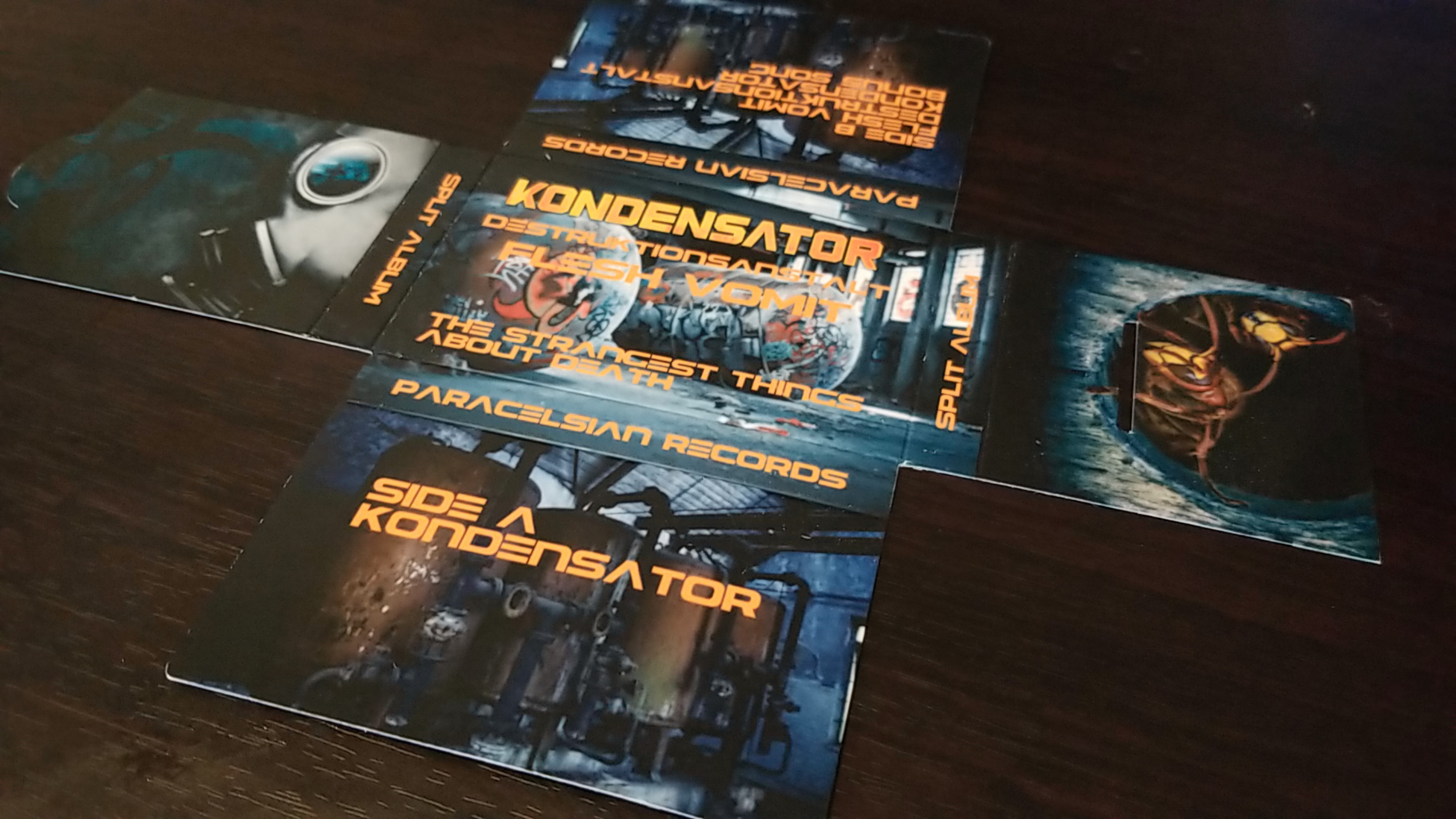 I've worked on this Kondensator album from June to November 2019 , then I was talking with a few people , finally ended up going with Destruktionsanstalt who recommended Flesh Vomit for this split release. I was impressed with the brutality and sheer heaviness from Flesh Vomit's songs ! Destruktionsanstalt has some quite dark ambiances similar to Kondensator , quite a good match for this release.